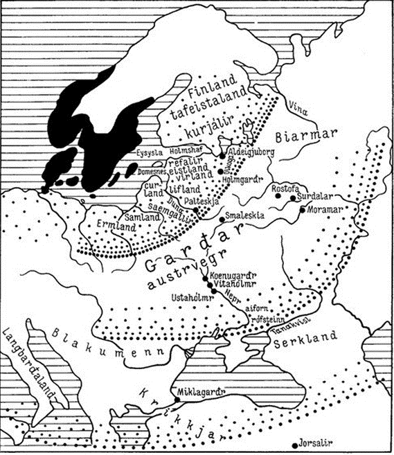 В Скандинавии IX–XII веков Древнюю Русь называли страной городов – Гардарики (др.-сканд. Garðaríki)[46] или Гарды (Garðar)[47]. В висе скальда Халльфреда Оттарссона (ок. 967–1007)[48] сохранилось самое раннее письменное упоминание Руси – Гардарики (Гардар, Гардавельди). Слово Гардарики восходит к древнескандинавскому garðr – ограда, забор, укрепление, крепость. Другое название Древней Руси – «Великая Свитьод» (древнеисл. Svíþjóð, древнешвед. Svethiudh) говорит о религиозном восприятии Древней Руси свеями и готами, как прародине из которой вышли их боги и предки. Свитьод Великая, или Холодная (SviÞjóð in mikla еðа in kalda) встречается в контексте излагаемой в начальных главах «Саги об Инглингах» (1220–1230) исландского скальда Снорри Стурлусона (1179–1241) – легенды о заселении Скандинавии, согласно которой предками шведских и норвежских конунгов являются языческие боги во главе с предводителем асов – Одином. Как следует из дальнейшего изложения Снорри, Великая Свитьод расположена одновременно в Европе и в Азии, так как через нее протекает Танаис (совр. р. Дон), разделяющий Европу и Азию. Из Асаланда (Великая Свитьод) Один со своими спутниками переселился на север в «Малую Свитьод» (Скандинавия). Снорри Стурлусон в своих произведениях показывает, что скандинавская Малая Свитьод (Свеаланд) получила имя от Великой Свитьод – Руси! Самое раннее упоминание Великой Свитьод в исландских источниках имеется в «Саге о Скьёльдунгах» (1180–1200). Прямое отождествление Великой Свитьод со Великой Скифией-Русью находятся в географических трактатах (XII в.). Наименование Sviþjόð hinn mikla возникло в контексте о происхождении скандинавских народов от асов, мигрировавшими на север, в «Малую Свитьод» под предводительством вождя Одина. Название «Великая Свитьод» образовано по типу античного и средневекового обозначения востока Восточной Европы – «Великая Скифия». Для викингов Гардарики – Великая Свитьод – Великая Русь является родиной их легендарных богов и предков. Поселившись в Скандинавии, викинги не имели никакого отношения к русскому и славянскому этногенезу и государственному строительству, отстав в своем развитии на многие столетия! Свидетельством этого является слабая заселенность Скандинавии, отсутствие больших городов, высшей централизованной государственной власти, законов, развитых ремесел, почти полное отсутствии крестьянства и пр. Викинги занимались только разбоем, наемничеством и торговлей. Если на территории Швеции с VIII по XIII века было построено только 6 городов (!), то на землях Полабской Руси в этот период документально зафиксировано («Баварский географ») 4353 города, а на территории Великой Руси – 1656 городов из них 300 северорусских и 356 южнорусских городов-крепостей с посадами, торгами и садами и 1000 не укрепленных городов! Викинги были наемниками и захватчиками, не имели ни развитой науки и культуры, законодательства, верховной власти, опыта строительства больших городов, обустроенных по лучшим мировым образцам того времени. Как они могли создать где-либо в мире «новое государство», если они у себя смогли создать королевство только к XIV веку!?