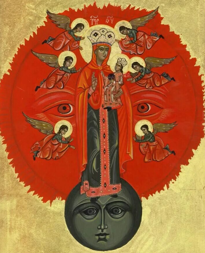 «И явилось на небе великое знамение: жена, облеченная в солнце; под ногами ее луна, и на главе ее венец из двенадцати звезд. Она имела во чреве, и кричала от болей и мук рождения. И другое знамение явилось на небе: вот, большой красный дракон с семью головами и десятью рогами, и на головах его семь диадем. Хвост его увлек с неба третью часть звезд и поверг их на землю. Дракон сей стал перед женою, которой надлежало родить, дабы, когда она родит, пожрать ее младенца. И родила она младенца мужеского пола, которому надлежит пасти все народы жезлом железным; и восхищено было дитя ее к Богу и престолу Его. А жена убежала в пустыню, где приготовлено было для нее место от Бога, чтобы питали ее там тысячу двести шестьдесят дней. Когда же дракон увидел, что низвержен на землю, начал преследовать жену, которая родила младенца мужеского пола. И даны были жене два крыла большого орла, чтобы она летела в пустыню в свое место от лица змия и там питалась в продолжение времени, времен и полвремени. И пустил змий из пасти своей вслед жены воду как реку, дабы увлечь ее рекою. Но земля помогла жене, и разверзла земля уста свои, и поглотила реку, которую пустил дракон из пасти своей. И рассвирепел дракон на жену, и пошел, чтобы вступить в брань с прочими от семени ее, сохраняющими заповеди Божии и имеющими свидетельство Иисуса Христа» (Откр. 12, 1–6; 13–17).